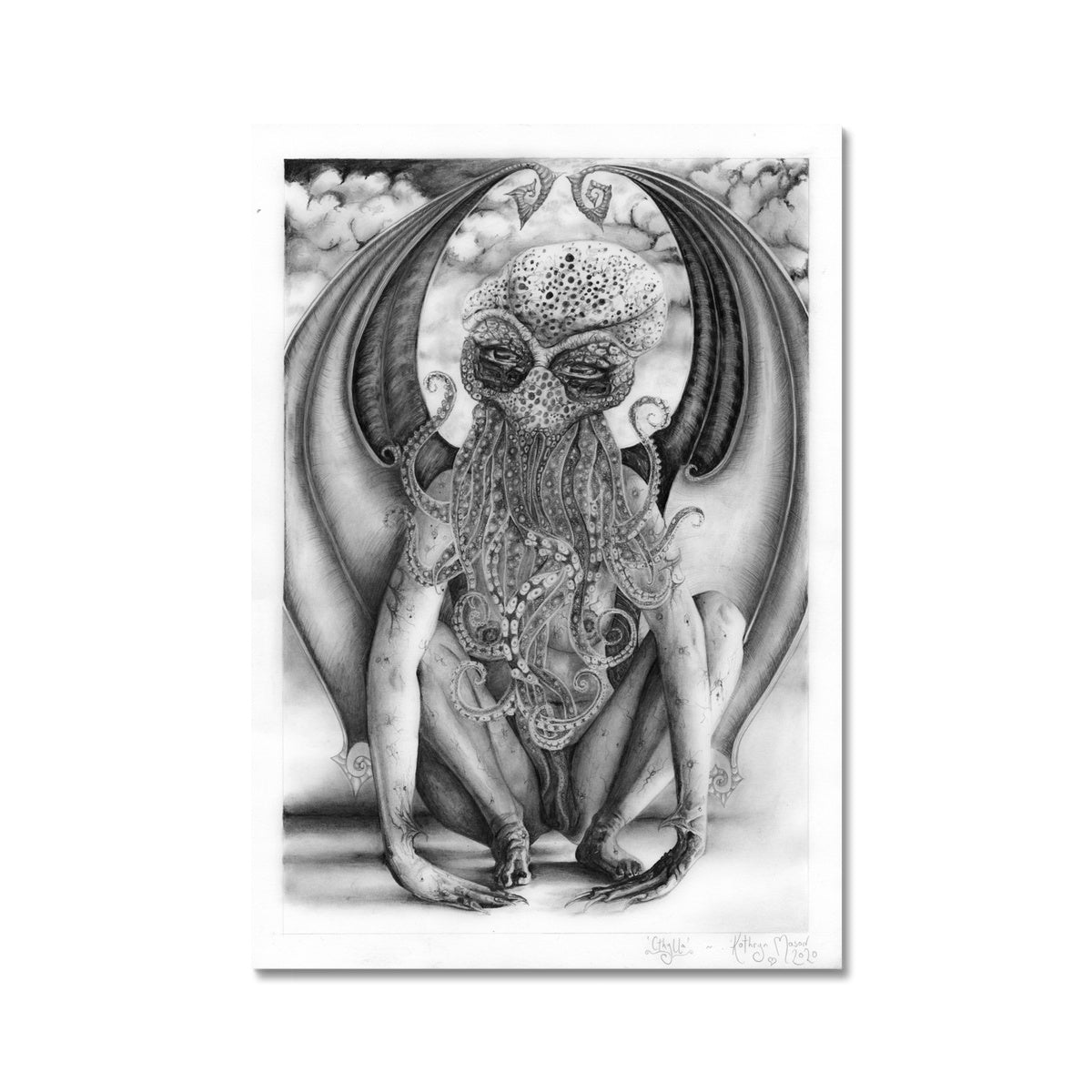 This wonderfully creepy cephalopod print shows the beautiful details of Kathryn Mason's original drawing inspired by H.P.Lovecraft's Cthulhu mythos, smudges, signature and all, lovely! Print carefully profiled for fantastically accurate and consistent reproductions using giclée printing techniques.